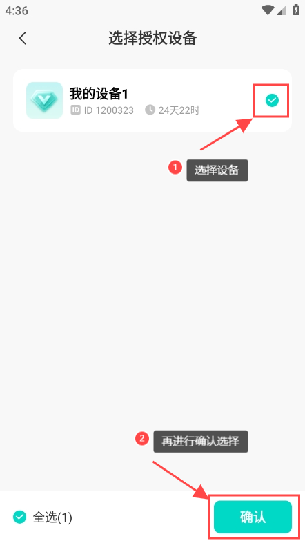 2、进入授权界面后,选择需要授权的设备,确认选择。