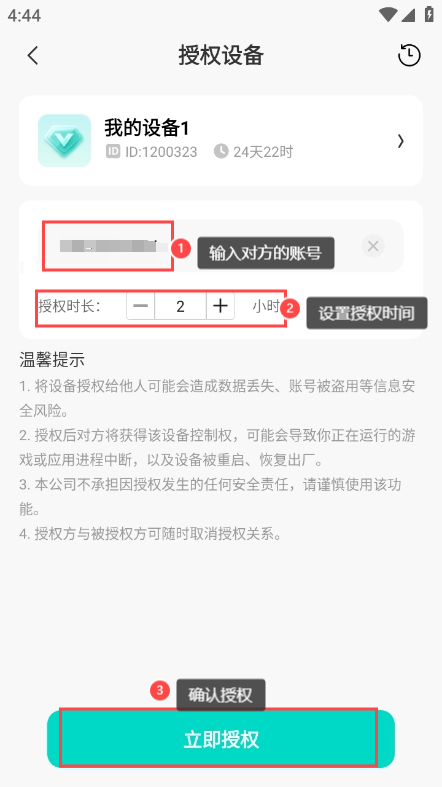 3、确认设备后,返回到授权页面,输入需要授权人的账号,再设置好时间后,立即授权即可