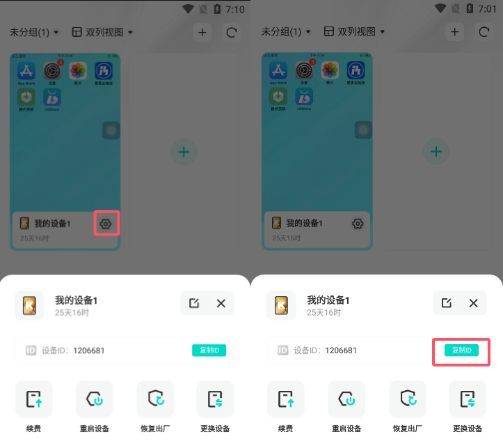 在“云手机”界面,点击要复制id的设备,那里有个齿轮状,然后再点“复制id”即可