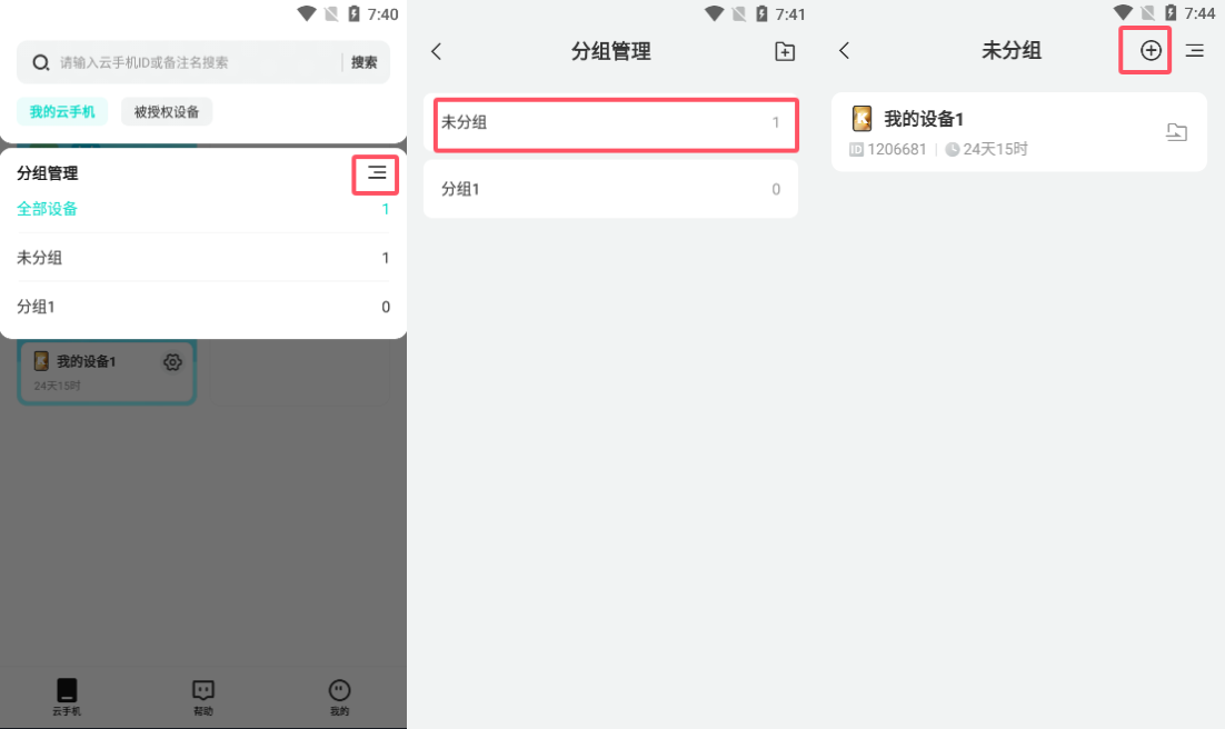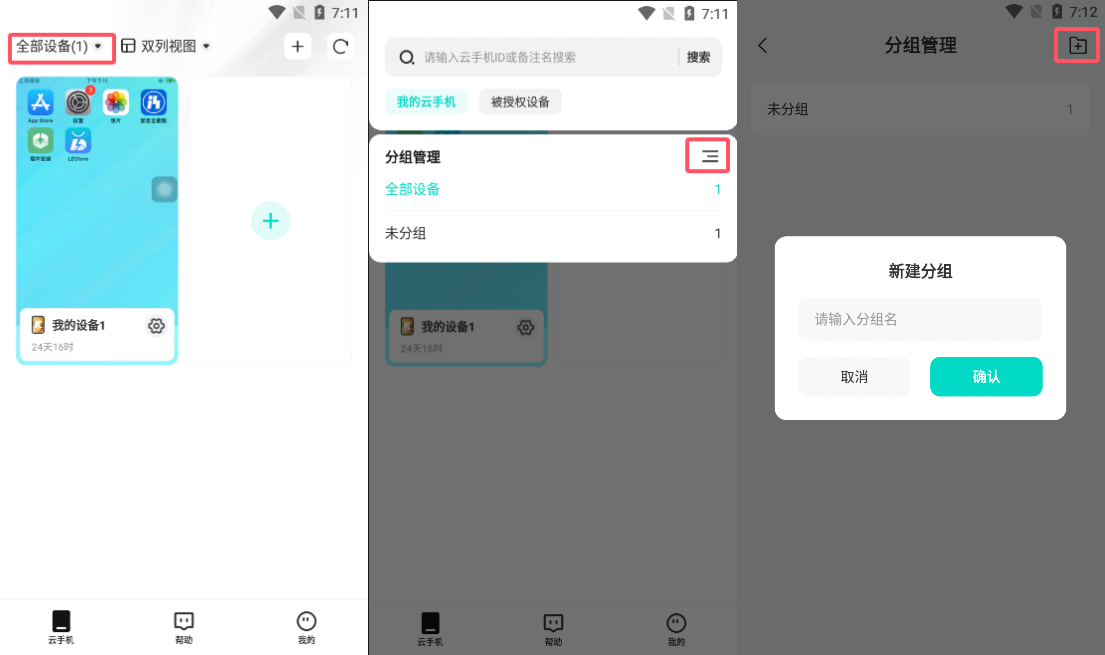 在“云手机”界面点左上角,然后点击分组管理旁边的,最后点右上角既可以创建新的分组
