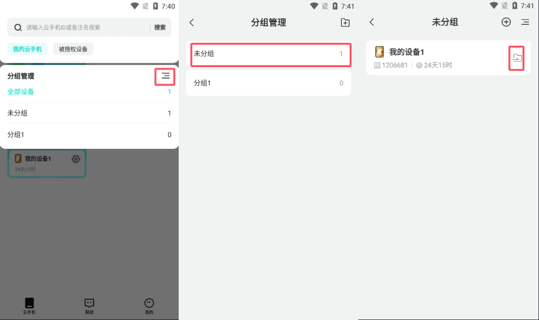 在“云手机”界面点左上角,然后选择自己需要的分组就可以看到这个分组下的设备。