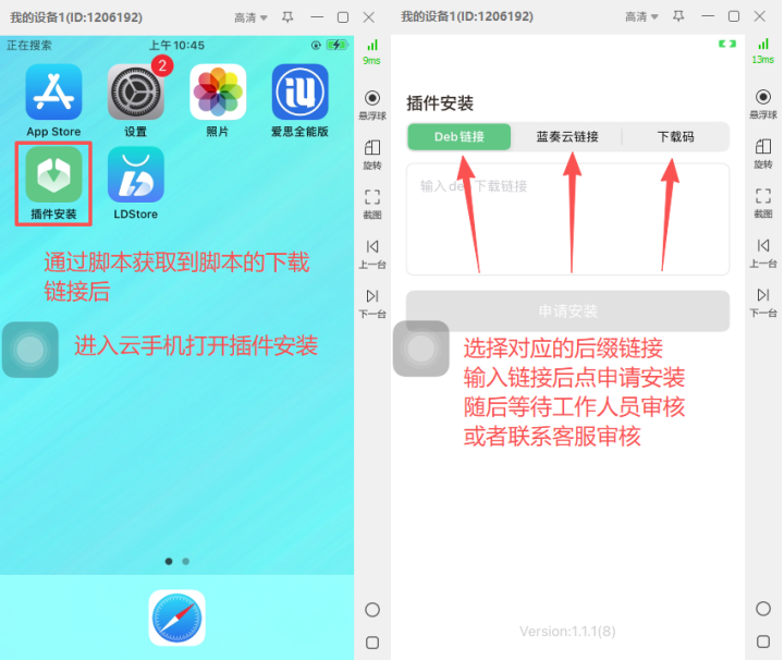 在驰电云手机桌面上,找到“插件安装”进入后把从脚本方那边获取到的iOS端脚本链接复制到对应后缀链接上,点击申请安装