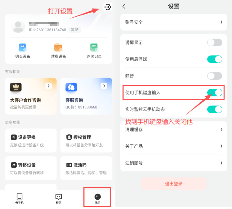 解答:当云手机的输入法与真机的输入法产生冲突,这个时候就会导致云手机里面的输入法键盘没有办法弹出来,这个时候我们就需要到客户端的时候里,把手机键盘关闭,具体操作如下图所示: