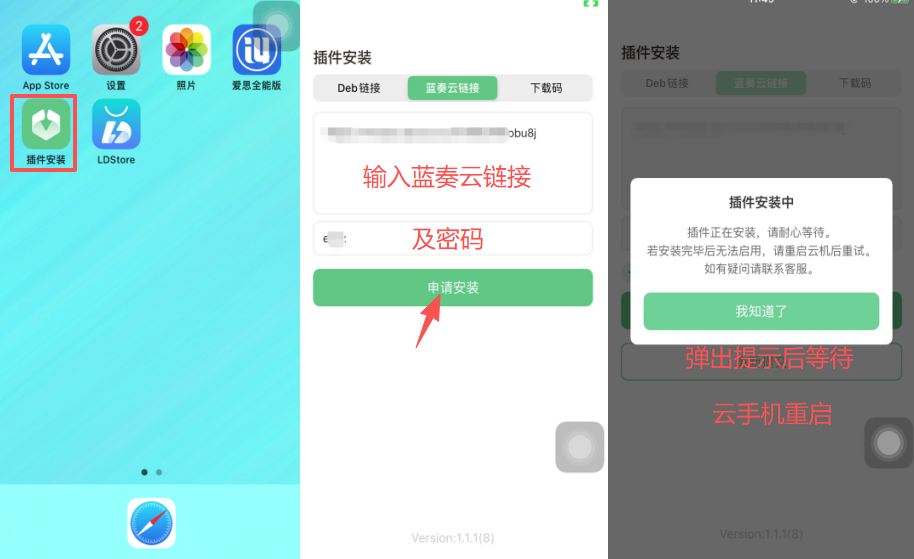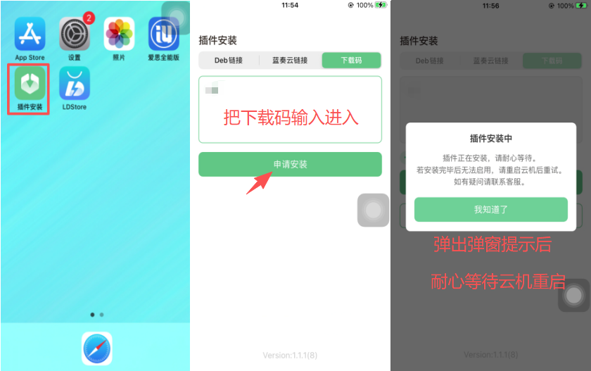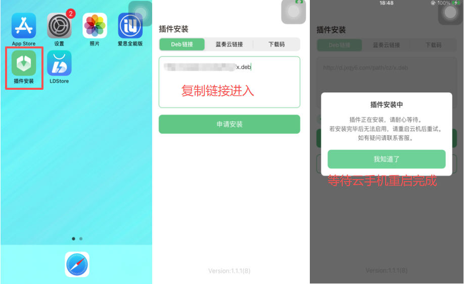 - 弹出插件安装中弹窗后,原地等待云手机重启