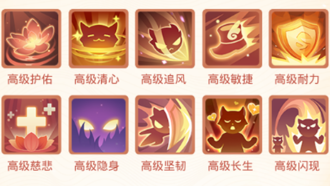 高级护佑、高级清心、高级追风、高级敏捷、高级耐力、高级慈悲、高级隐身、高级坚韧、高级长生、高级闪现