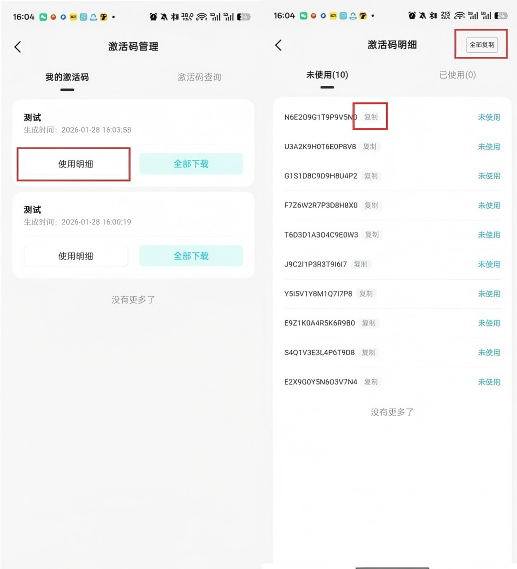 如果需要单独复制某一个激活码,则只需点击激活码后方的