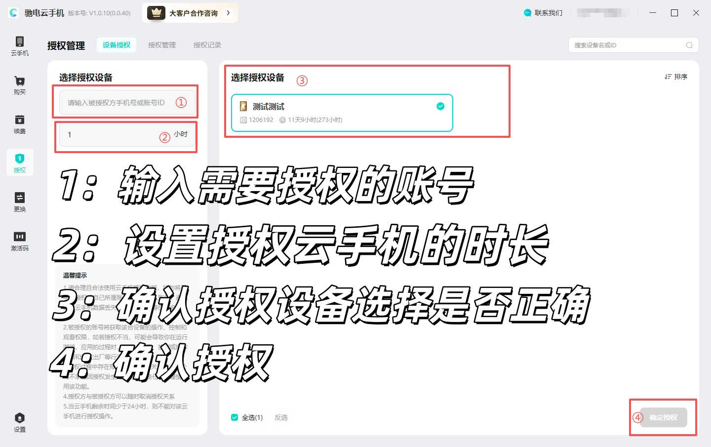 3:二次核对授权云手机设备、被授权账号、授权时效等核心信息,确认无误