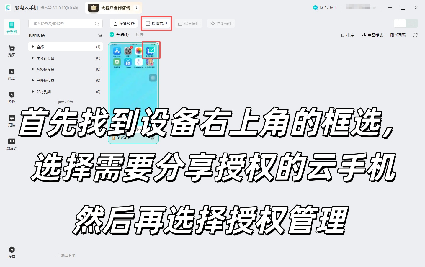 1:在云手机列表中,选中您需要对外授权分享的目标云手机