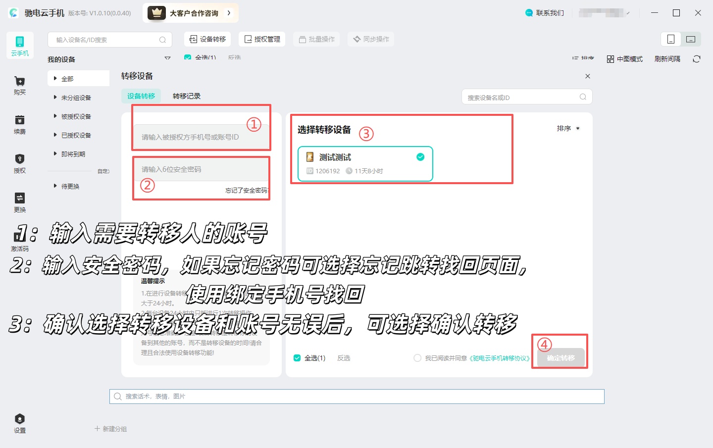 2:在指定输入框内,准确填写设备接收方的驰电云账号,再输入您的账号安全密码;二次核对转移设备、接收方账号等核心信息,确认全部无误后,点击【确认转移】,即可完成设备转移操作。