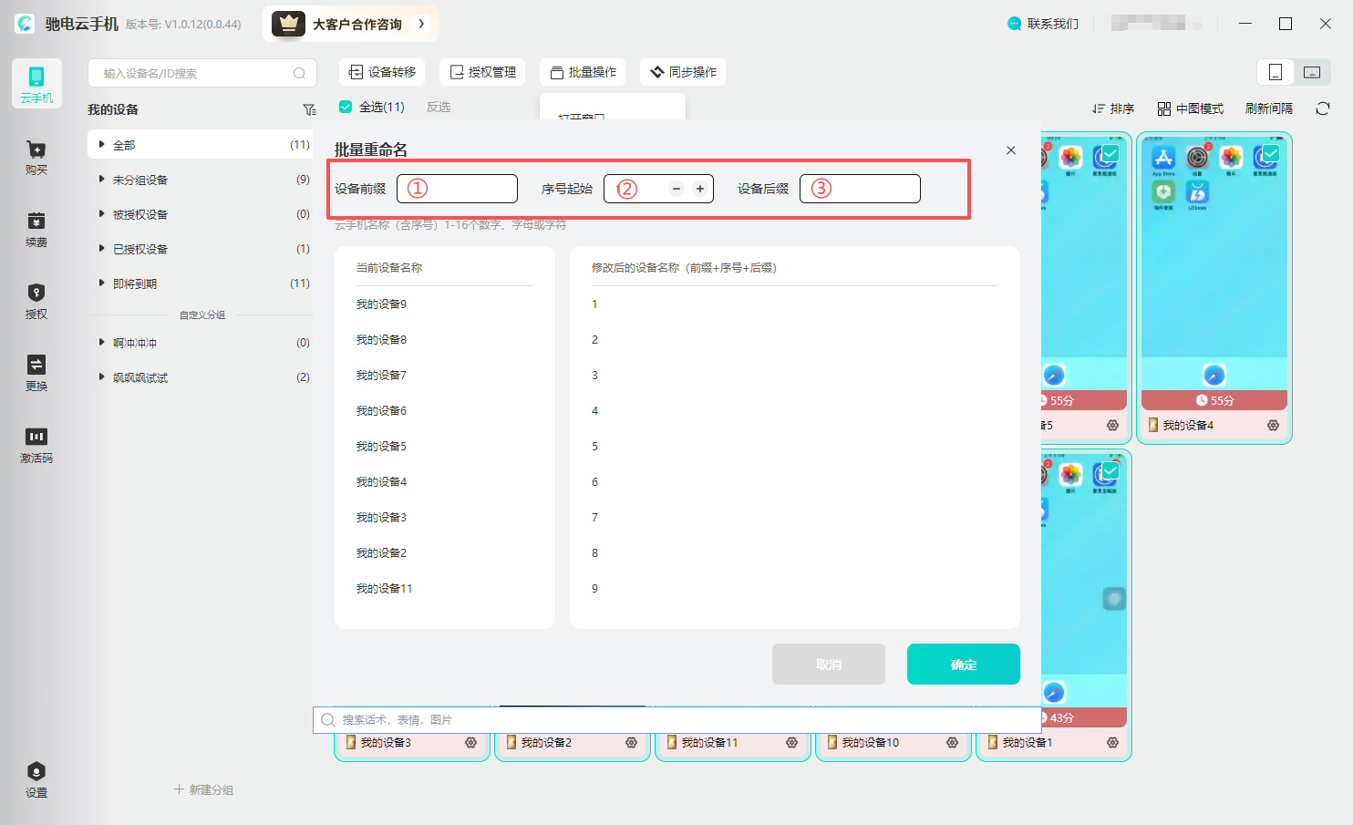打开批量重命名功能后,在【设备前缀】中输入自定义名称,再在【序号】栏选择 1~10 的排序数字,即可完成命名