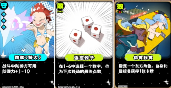 吉星派对中有各种不同效果的卡牌,它们总体上分为战斗牌和效果牌两大类。在噩梦及以上难度,开局每位角色都会得到初始的两张效果牌和两张战斗牌。在困难及以下难度,初始卡牌会增加至三张效果牌和三张战斗牌。